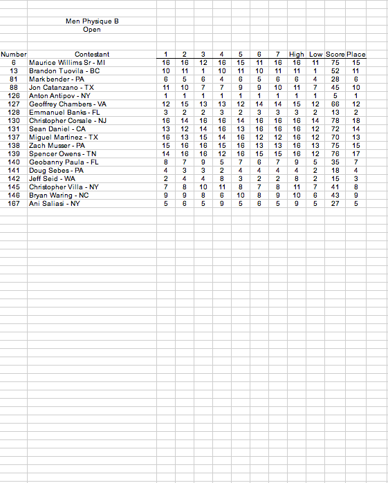 I arrived at 5:28, to find Dave Pulumbo interviewing the Physique Overall champ. I couldn't believe it. I had just missed my division. All my work. What next? I was directed to the guys that had the placing info. I was told I had placed 2nd to the overall champ. And that I could find the official score cards online. http://npcnewsonline.com/2012-ifbb-north-americans-mens-physique-official-score-sheets/28139/class-b-4/ The results of the show were great. The judging panel scored me in second place.
